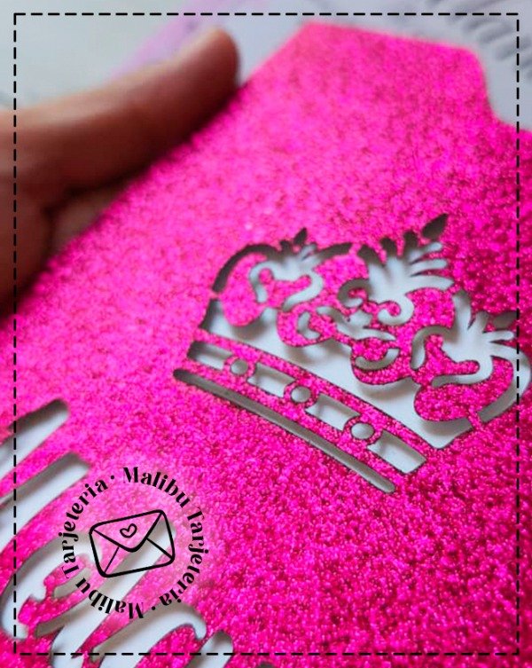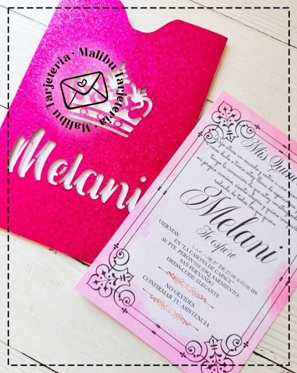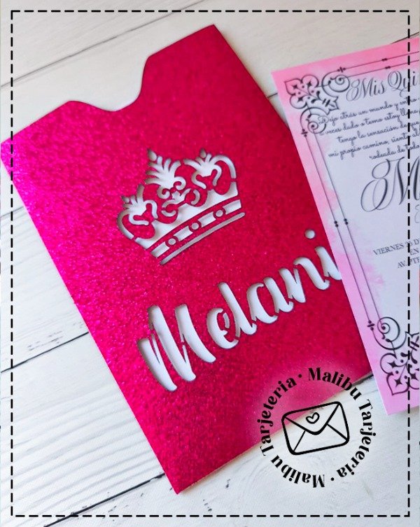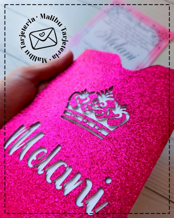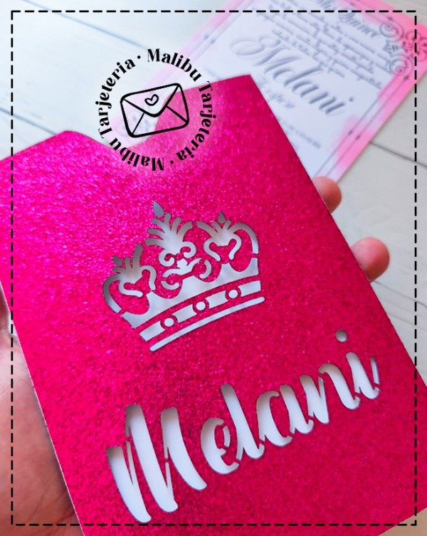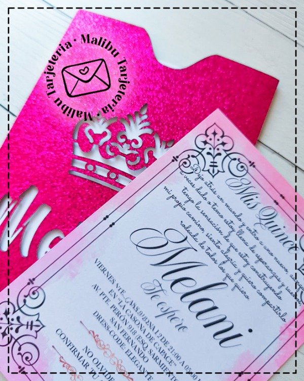 Este elegante conjunto incluye un sobre calado de 12 cm de ancho por 17 cm de alto, acompañado de una invitación impresa a todo color.